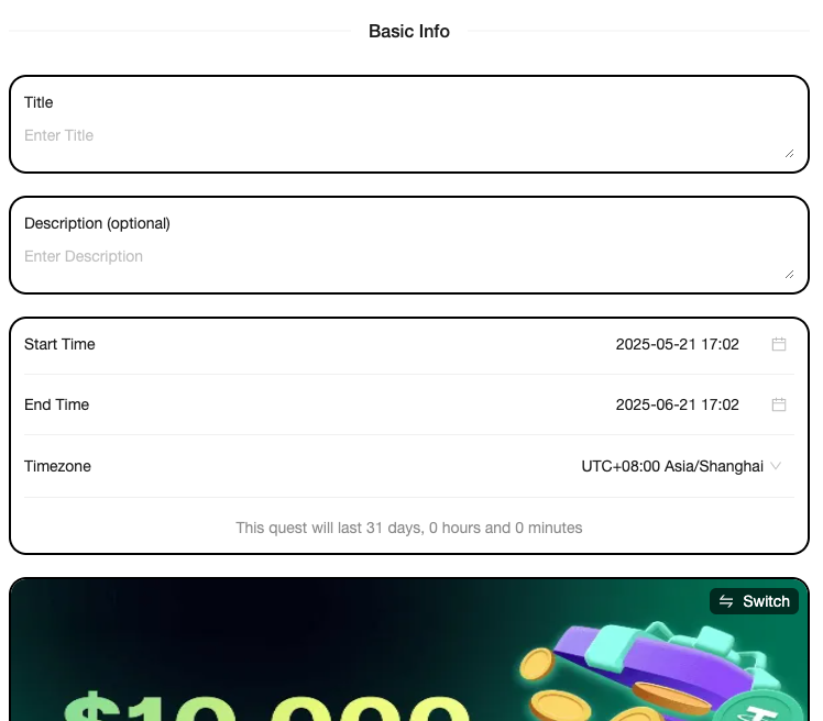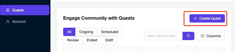 Navigate to "Quests" in the sidebar and click "Create Quest"